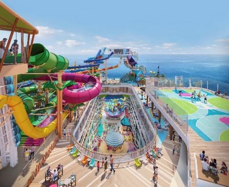 拥有6条破纪录的水滑道,橙色霹雳,垂直入口 , 海上超高垂直滑道;金色深渊,陡峭程度66度,海上开放式自由落体滑道;蓝色狂飙,海上PK比赛双滑道;绿色漩涡,海上漂流多人橡皮筏水滑道,中间有失重体验;紫色激流,海上多人橡皮筏水滑道,中间有两个水幕。