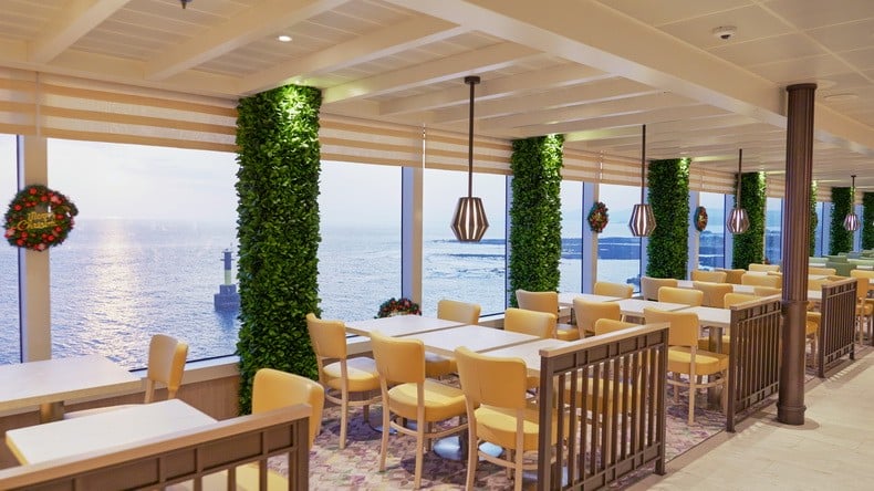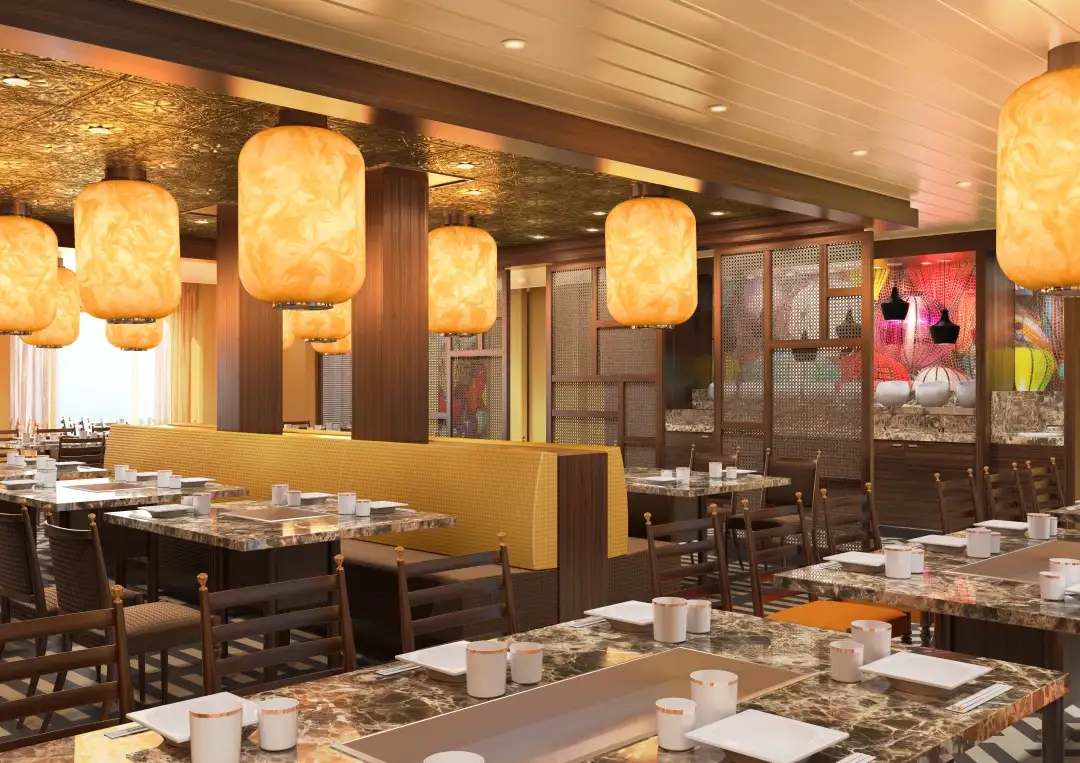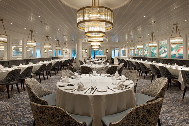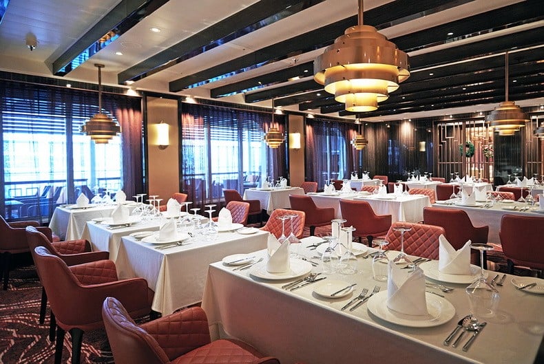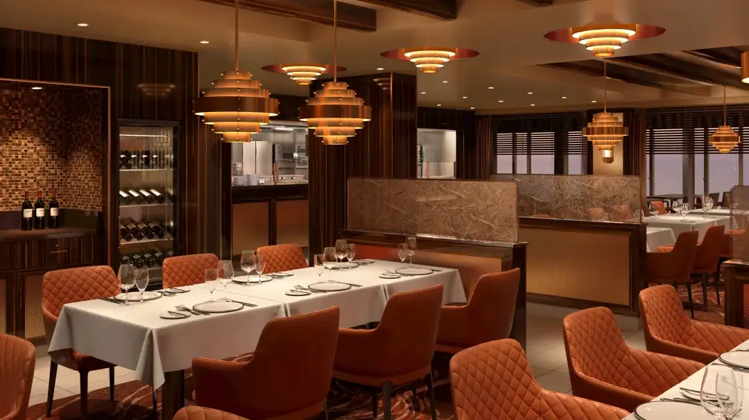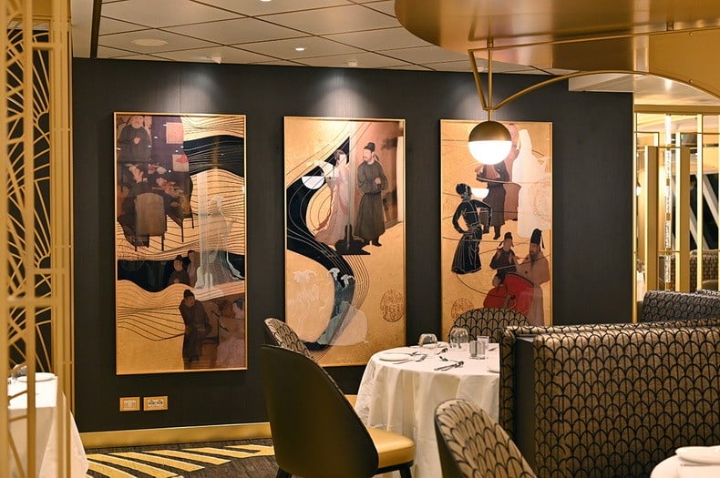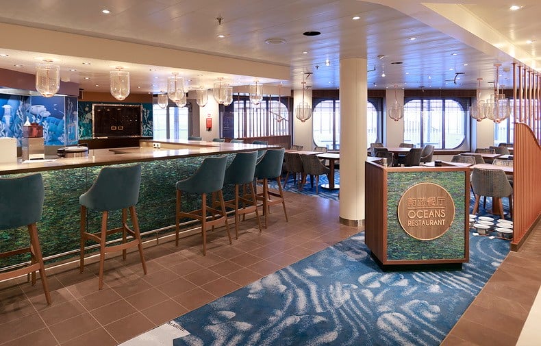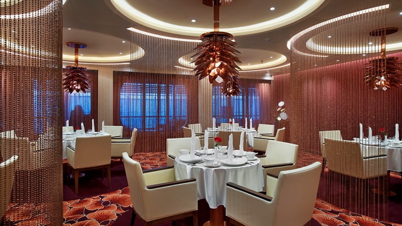 富丽堂皇的宫廷餐厅,跨越三至四层甲板。中央的光雕艺术品连接两层甲板,金色、黑棕和白色的色彩组合精巧地应用于现代艺术装饰风格,营造出奢华优雅的氛围。