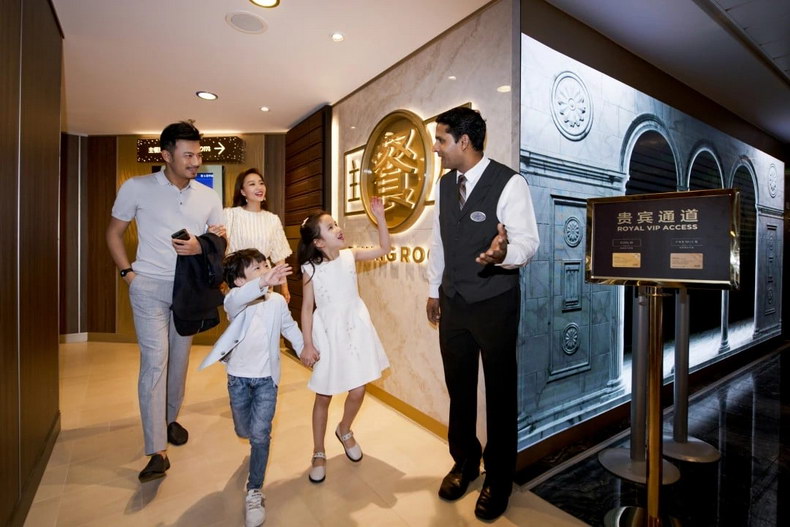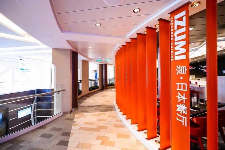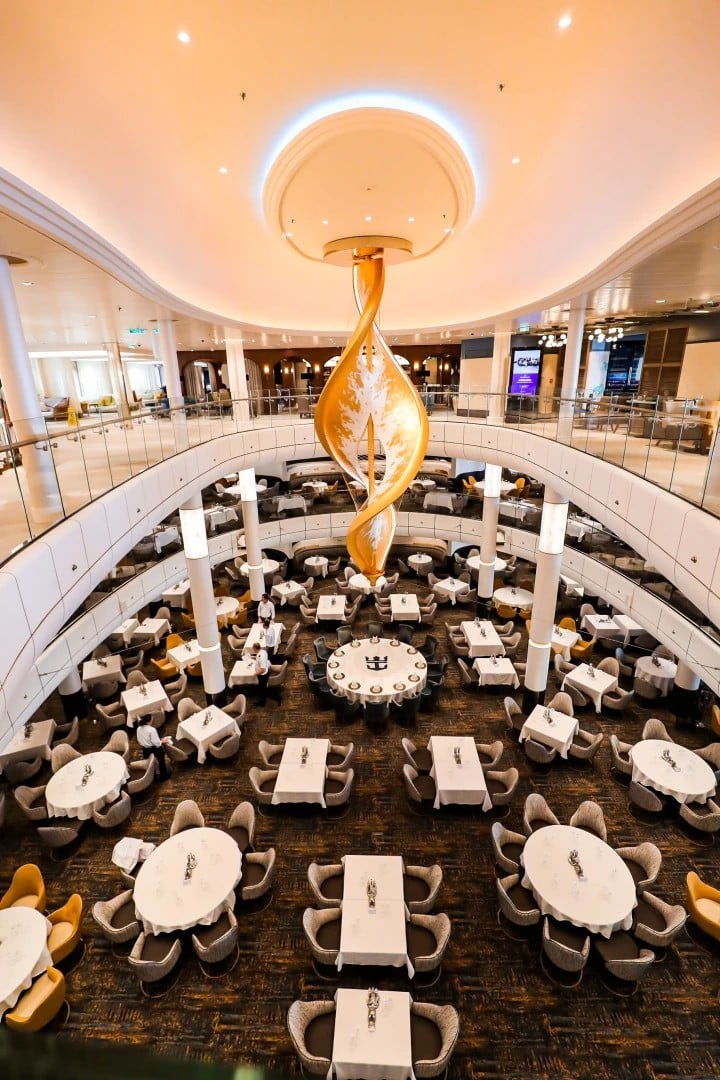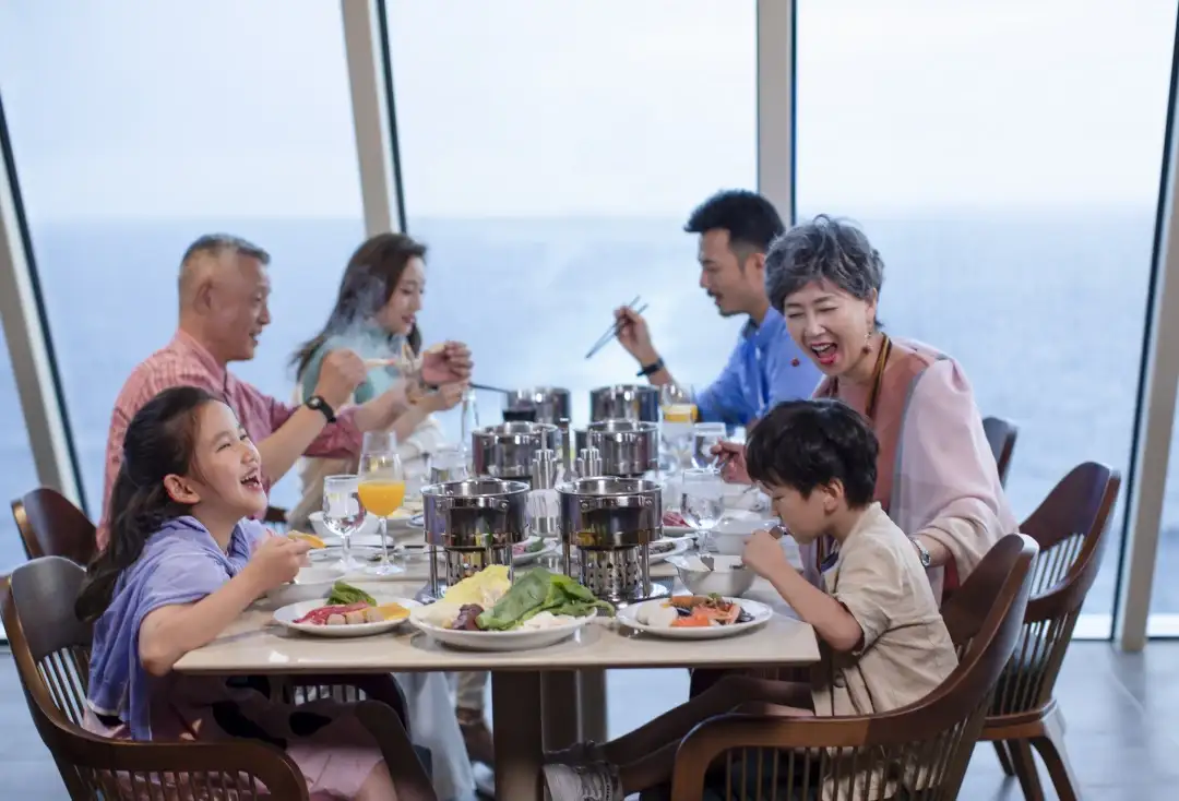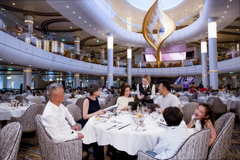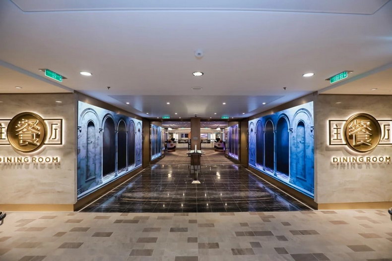 4间独立主餐厅合并3层挑高、可容纳1844人的盛宴式免费主餐厅,行程中每天提供不同的中西两种菜谱供游客单点,自由选择分餐或家庭分享。