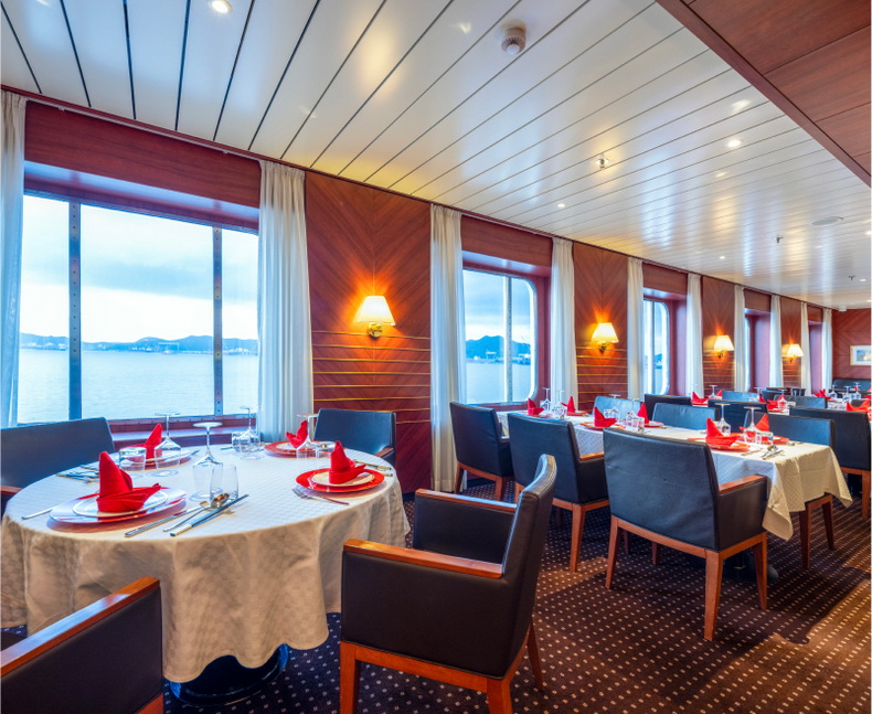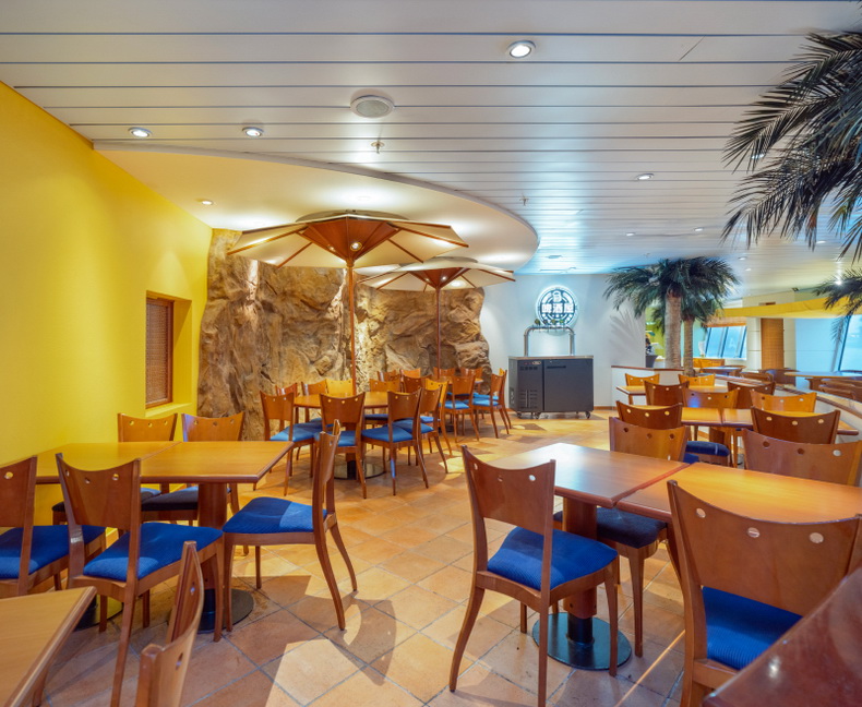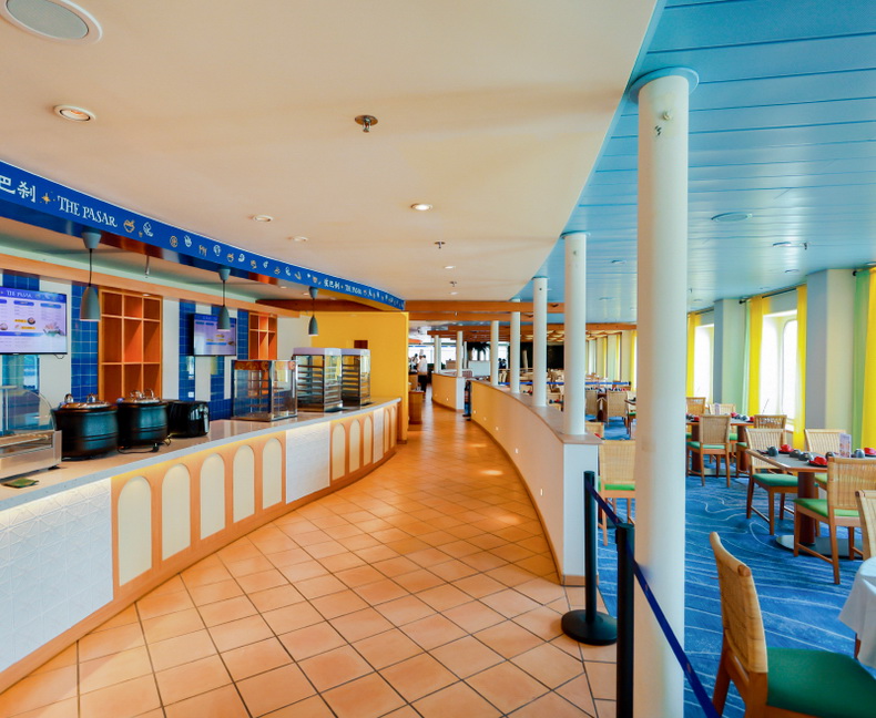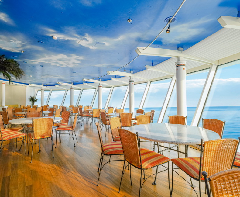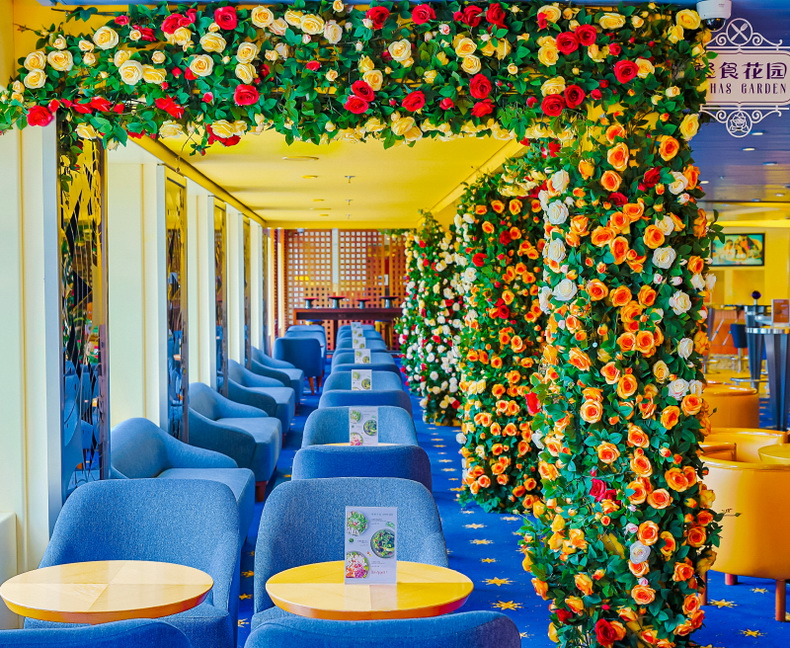 以浪漫优雅的法式花园为装潢特色,拥有全船绝佳用餐视野——270°落地海景玻璃,全天候供应从中式时令风味到西式佳肴甜品的全球特色美食,旅客尽情欣赏大海美景,用餐体验更加升级。