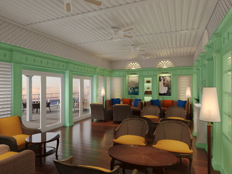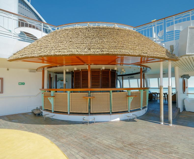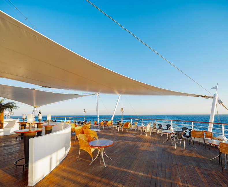 室外露台区域的吧台拥有令人惊叹的广阔视野,夜幕降临时,若是恰巧停靠在港口,旅客可在吧台零距离感受璀璨夜景。