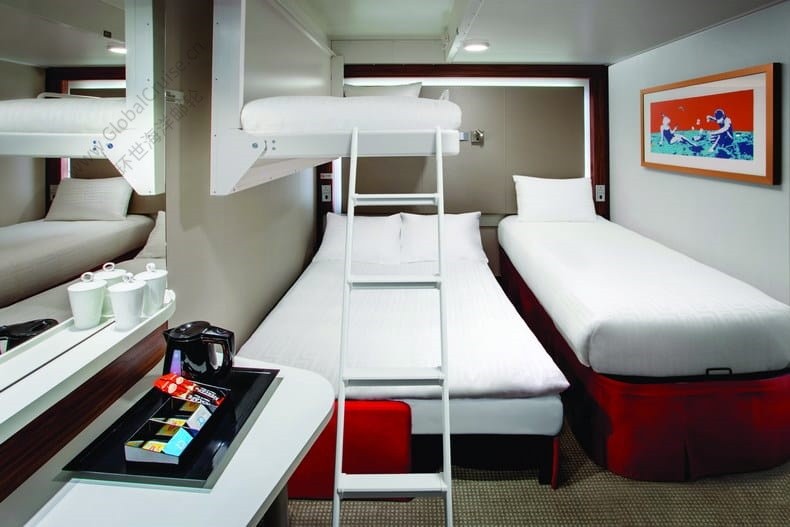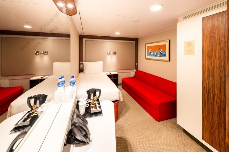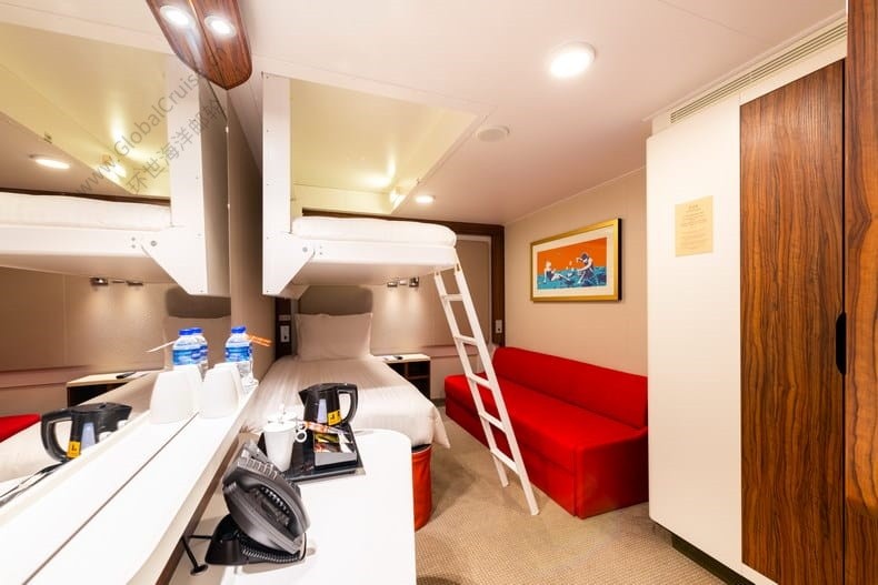 双人房配有2张单人床; 三人房配有2张单人床+一张壁柜床(上船后可请客房服务人员协助打开);四人房配有1张单人床+1张双人沙发床+1张壁柜床(上船后可请客房服务人员协助打开)。