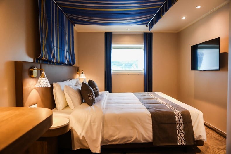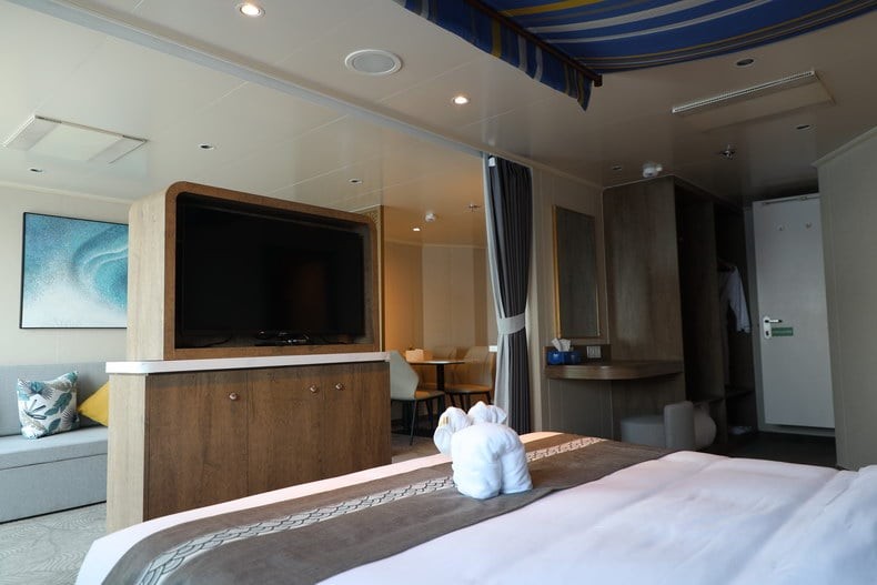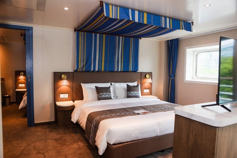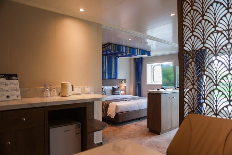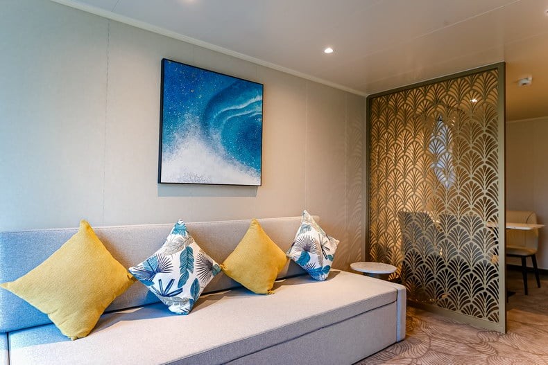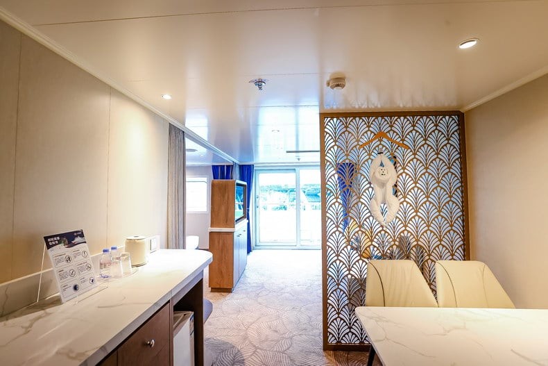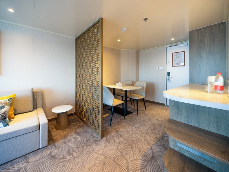 舱房介绍:房间总面积包含阳台面积,位于7楼船头,精致的家私、舒适的床品、多样的客卧设计、私密的主卧,每一个细节都透露着品质与匠心。长约八米的宽敞阳台可以尽情享受阳光和海风的拥抱,为您带来无与伦比的“海上之家”旅居体验,双卧室+双卫生间配置,房间内的双人沙发床可供第5~6位旅客入住,预订此房型享金卡VIP礼遇。