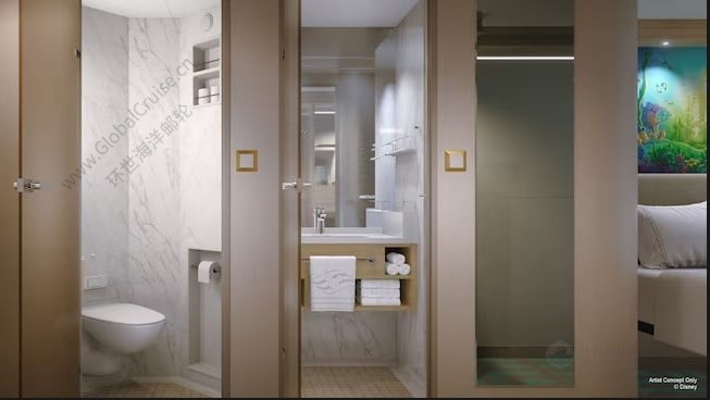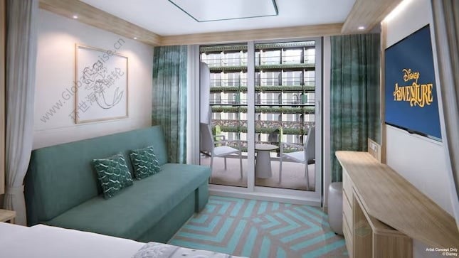 大床、双人沙发床。干湿分离浴室,玻璃门淋浴间,隐私隔板,50英寸电视。私人阳台可俯瞰迪士尼奇想花园。