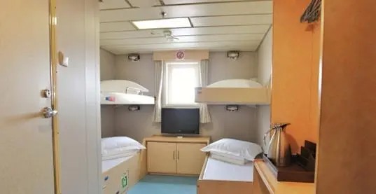 2组上下铺、观景窗、独立卫生间、电视机;电视机柜、挂衣钩;行李架;呼叫器。本房型仅售卖高级海景房的上铺铺位,需要与其他旅客共用1间房。如您在同一订单或关联订单中选择多个铺位,我们将尽量为您安排在同一房间。